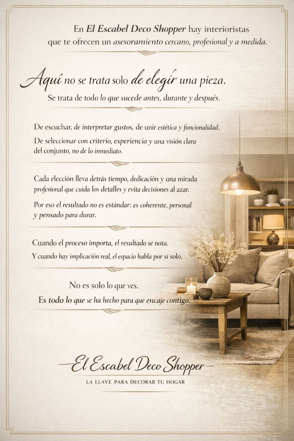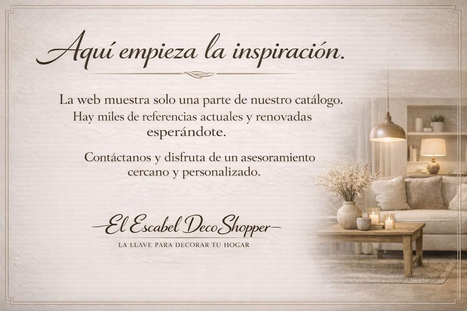 El Escabel es un espacio único, con mas de 15.000 referencias en continua renovación. Todo lo relacionado con la decoración, creación de ambientes únicos, artículos exclusivos, especialista en mueble auxiliar y recibidores, dormitorios, gran variedad en espejos y cuadros de todos los estilos y diseños, regalo personal y complementos.